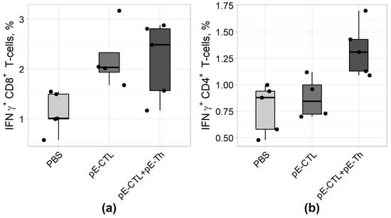 The capacity of vaccine constructs to induce IFNγ-producing CD4+ and CD8+ T-cells was tested by ICS after stimulating splenocytes with specific peptides. The results of ICS (Figure 5) revealed that statistically significant difference from control (Table 4) was demonstrated by IFNγ-producing CD8+ T-lymphocytes in animal groups immunized both with pEV.CTL and a mix (pEV.CTL + pEV.Th) DNA vaccines as well as by IFNγ-producing CD4+ T-helpers in the group immunized with only a mix of vaccine constructs (pEV.CTL + pEV.Th). The maximal responses of IFNγ-producing CD8+ T-lymphocytes (p = 0.024) and CD4 + T-cells (p = 0.012) were registered in the animal group immunized with a mix of vaccine constructs. This is believed to be caused by the synergistic effect of CD8+ and CD4+ T-lymphocytes.
