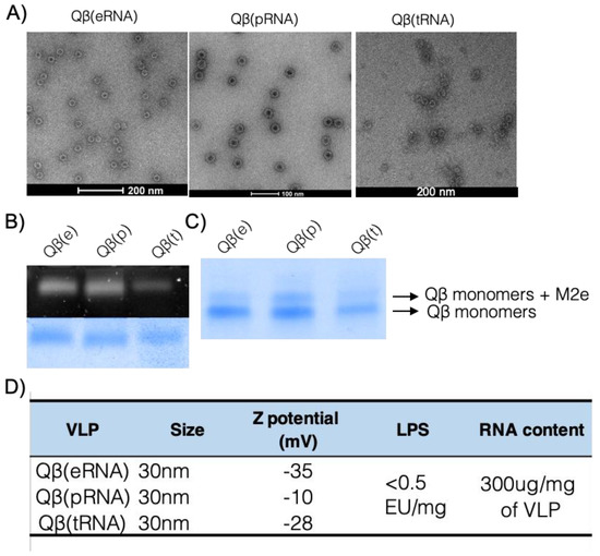 Figure 1. Vaccine preparation and characterisation. (A) Electron micrograph of re-assembled VLPs. Qβ VLP containing eukaryotic RNA (eRNA), prokaryotic RNA (pRNA) and tRNA (tRNA) have similar structure and size. (B) Native analysis of RNA and protein content of re-assembled VLPs. Upper panel showing SYBR staining and bottom panel showing protein staining of same agarose gel. (C) Similar coupling efficiency of different VLPs and M2 peptides on a reduced SDS-PAGE gel electrophoresis. (D) Characterisation of VLPs. Size was taken as an average of values obtained in the EM images. Z potential was measured by DLS and is expressed as mV. LPS content expressed on endotoxin units (EU) per milligram of VLP. Average RNA content per mg of VLP. Results are representative of more than 5 independent purification and re-assembly studies.