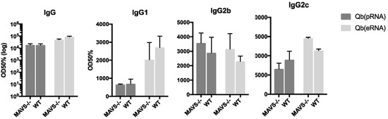 Previous literature shows that RNA promotes isotype switching promoted by direct TLR7 engagement in B cells. Recent literature, however, suggests an additional role for cytosolic RNA sensors in the modulation of the humoral response [26]. Secondary modifications in the RNA is a prominent feature distinguishing prokaryotic from eukaryotic RNA recognized by the cytoplasmic RNA sensor RIG-I. To investigate a possible role for RIG-I in driving IgG2 responses, sex and age matched mice lacking the RIG-I downstream adaptor molecule MAVS were immunised following the same regimen and the IgG subtypes were evaluated 10 days after immunisation (Figure 3). For all the parameters evaluated, MAVS knockout had similar levels of total IgG, IgG1 and IgG2b/c, ruling out a role for the RIG-I/MAVS pathway in regulating isotype switching mediated by prokaryotic RNA in VLPs.