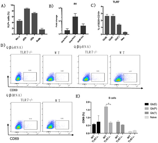 Figure 4. TLR7 dependent immune response of B cells and DCs. (A) Axis indicates the percentage of macrophages (Mmo), pDCs, cDCs and B cells positive for E. coli-expressed Qβ 24 h post injection. (B) Induction of the ift1 gene on 3T3 cells treated with serum of mice immunised with VLPs loaded with different RNAs 20 h post immunisation, measured by RT-qPCR. Data are presented as fold changes compared to the average cells treated with sera of naïve mice. (C) TLR7 expression in B cells (B220+CD19+) from immunised mice 24 h post immunisation. (D) CD69 expression on splenic B cells 24 h post immunisation of WT and TLR7 knock out mice. Gated on B cells (B220+CD19+). (E) Bar plot of CD69 expression on B cells 24 h post immunisation. Data represented as mean + SEM n = 3 mice. * p < 0.04. Results are representative of 2 independent experiments.