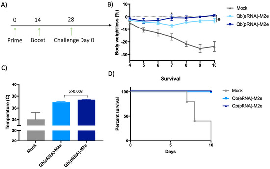 Figure 5. Reduced morbidity symptoms of mice immunised with formulations containing prokaryotic RNA in an influenza challenge. (A) Immunisation and challenge schedule. 8–12 weeks female BALB/c mice were immunised s.c. with 50 μg of Qβ(pRNA)-M2e or Qβ(eRNA)-M2e, or PBS as a control on day 0 and 14. Mice were then challenged with a lethal dose of the mouse-adapted influenza A/PR/8/34 virus (2 × LD50) on day 28. (B) Body weight (%) represented as the mean +/− SEM percentage of weight loss (n = 5 mice). Statistical significance measured by Welch’s T test (p < 0.007). (C) Average temperature from day 4 to 11 post challenge. mean +/− SEM (n = 5 mice). Statistical significance measured by Welch’s T test (p < 0.008). (D) Percentage of survival of immunised and control groups following challenge. *: One mouse from the Qβ(pRNA) group was prematurely culled due to unrelated sickness. Mice that reached the limit severity score were euthanised and the last observed parameter was used for the following days and average calculations (Last observation carried forward, LOCF).