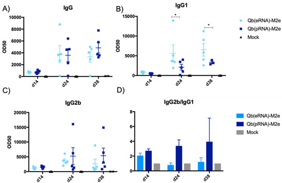 Figure 6. Humoral responses against M2e. Circulating levels of IgG, IgG1 and IgG2b measured on day 14, day 24 and day 38. Vaccine dose was 50 μg of VLP, injected s.c. Qβ(eRNA)-M2e induces significantly higher levels of antigen-specific IgG1 compared to the other vaccines (* p > 0.04) against VLP and M2. Ratios of IgG2b:IgG1 are represented as the ratio of the isotype geometric mean titres (OD50). Antibody data represented as mean + SEM, n = 5. Ratio represented by mean ratio of IgG2b/IgG1 + SEM. N = 5.