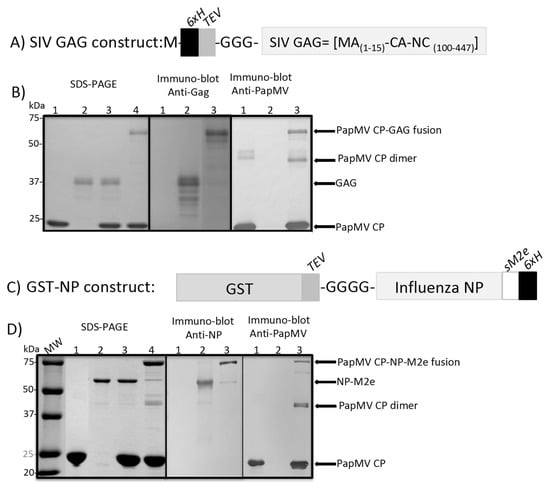 Coupling of the recombinant proteins to the PapMV nanoparticle (nano) vaccine platform using sortase A (SrtA). (A) Schematic representation of the simian immunodeficiency virus (SIV) group-specific antigen (GAG) protein clone. In brief, a 6xH tag was fused directly after the first methionine (M) start codon followed by the tobacco etch virus (TEV) protease cleavage site, the GGG SrtA donor motif, the N-terminus of the SIV matrix (MA 1–15) and the fragment 100–447 of the SIV-capsid and nucleocapsid (CA-NC). Upon cleavage with the TEV, an extra G is added to the N-terminus of GAG, which generates the four glycine (GGGG) N-terminus of the protein. (B) SDS-PAGE (left panel), 1: PapMV nano (2 µg), 2: SIV GAG (0.3 µg), 3: PapMV nano (2 µg) + SIV GAG (0.3 µg) and 4: Nano-GAG (2 µg). Molecular weights markers are shown to the left of the gel. Immuno-Blot performed with anti-SIV mac p27 (middle panel), 1: PapMV nano (2 µg), 2: SIV GAG (0.3 µg), 3: Nano-GAG (2 µg). Immuno-Blot performed with anti-PapMV-CP (right panel). 1: PapMV nano (1 µg), 2: SIV GAG (0.15 µg), 3: Nano-GAG (1 µg). (C) Schematic representation of the influenza nucleoprotein (NP-sM2e) clone. The glutathione S-transferase (GST) was fused at its C-terminus to the TEV protease specific cleavage site followed by GGGG, the influenza NP gene, the influenza sM2e peptide and a 6xH tag. (D) SDS-PAGE (left panel), 1: PapMV nano (10 µg), 2: NP (1 µg), 3: PapMV nano (10 µg) + NP (1 µg) and 4: Nano-NP (10 µg). Molecular weights markers are shown to the left of the gel. Immuno-Blot anti-NP (middle panel), anti-PapMV CP (right panel), 1: PapMV nano (1 µg), 2: NP (1 µg), 3: Nano-NP (1 µg).