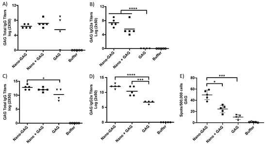 Coupling of the SIV GAG to the PapMV nanoparticle enhances the immune response directed to the GAG antigen. Balb/C mice, 5 per group, were immunized twice by the intramuscular route (i.m.) at a 21 day interval with, respectively, PapMV nano coupled to the Gag antigen (nano-GAG) (65 µg), PapMV nano (55.25 µg) mixed with GAG (9.75 µg) (Nano plus GAG), GAG alone (9.75 µg) and buffer control (10 mM Tris, 150 mM NaCL pH8). The assessment of the humoral response directed to the GAG recombinant antigen was performed with serum harvested at day 20 (A,B) or at day 33 (C,D). The anti-GAG total IgG (A,C) and IgG2a titers (B,D) were measured. The spleen was harvested at day 34 to perform the ELISPOT assay (E). The splenocytes were activated with the SIV GAG recombinant proteins. * p < 0.05, *** p < 0.001, **** p < 0.0001.
