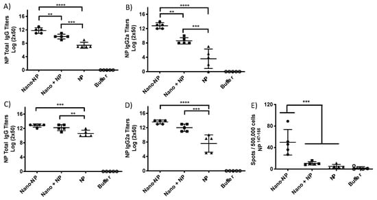 The immunoglobulins (IgG and IgG2a) titers of immunized animals were assessed after one and two immunizations, by ELISA, directed to the GAG (Figure 2) or NP antigens (Figure 3). The levels of total IgG of the animals immunized with the coupled GAG antigen (Nano-GAG), the uncoupled GAG mixed with PapMV nano (nano plus GAG) or GAG alone were comparable after a single immunization (Figure 2A). However, only the mice immunized with PapMV and GAG (coupled or not) showed IgG2a titers that significantly exceeded those of the mice immunized with GAG alone (Figure 2B). After two immunizations, the humoral response (total IgG and IgG2a) was increased in all groups. The group immunized with nano-GAG showed significantly higher total IgG titers when compared to the group immunized with GAG alone (Figure 2C). When the IgG2a titers were assessed, both groups containing the PapMV nano (coupled and not coupled) showed a significant increase when compared to the group immunized with GAG alone (Figure 2D). The adjuvant property of the PapMV nanoparticles was probably responsible for the increase of titers in the nano plus GAG group [,,,,]. However, the highest antibody titers to GAG were recorded in the mice immunized with coupled nano-GAG (Figure 2C,D). The coupling of the antigen to the PapMV nano (nano-GAG) significantly enhanced the capacity of CD4+ and CD8+ T cells of the vaccinated mice to produce interferon-γ (IFN-γ) upon stimulation of the splenocytes with the purified GAG antigen when compared with the antigen alone (Figure 2E). Interestingly, the nano plus GAG formulation did not significantly increase the IFN-γ secreting cells when compared with the antigen alone (Figure 2E).