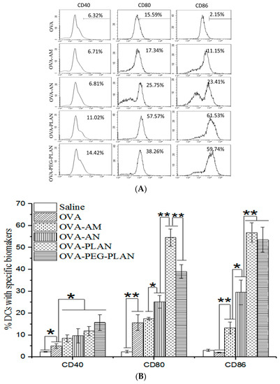 The ability of OVA-loaded Al-based carriers (AMs, ANs, PLANs, and PEG-PLANs) to activate APCs for maturation was tested with BMDCs [26]. Briefly, the cells cultured in a 24-well plate (0.5 × 105 cells/well) with 0.5 mL RPMI 1640 medium were fed with 50 µL of 20 µg soluble OVA or carrier-loaded OVA for 30 h stimulation. After refreshment of culture RPMI 1640 medium, BMDCs were exposed to the fluorochrome-conjugated Abs against CD40, CD80, and CD86, which are markers of maturation of the activated APCs.