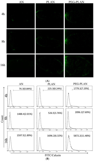 The prepared Al-based carriers, including AMs, ANs, PLANs, and PEG-PLANs, were evaluated of APC uptake using mouse BMDCs (mouse bone marrow-derived dendritic cells), which were derived from mouse bone marrow precursors according to previous reports [23,24]. For APC uptake assay, the BMDCs were first transferred onto a 24-well plate with 1 mL of 105 cells per well and incubated for 24 h in a cell culture chamber at 37 °C at an atmosphere of 5% CO2. Then, each well containing BMDCs was supplemented with 100 µL of free calcein or calcein-loaded carriers (AMs, ANs, PLANs and PEG-PLANs, at 10 µg/mL Al final concentration), and mixed homogeneously for another 4 h incubation in the cell culture chamber. After the incubation, the co-cultured cells were removed of the un-associated agents or nanocarriers through centrifugation at 800× g at 4 °C and thrice PBS washing. Finally, the cells were tested by flow cytometry (BD FACSVerse™, San Jose, CA, USA) and assayed with FlowJo software (Tree Star, Ashland, OR, USA) to evaluate cellular uptake of carriers. Also, a small fraction of cells was imaged by LSCM (with a laser scanning confocal microscope, Leica TCS SP5, Wetzlar, Germany).