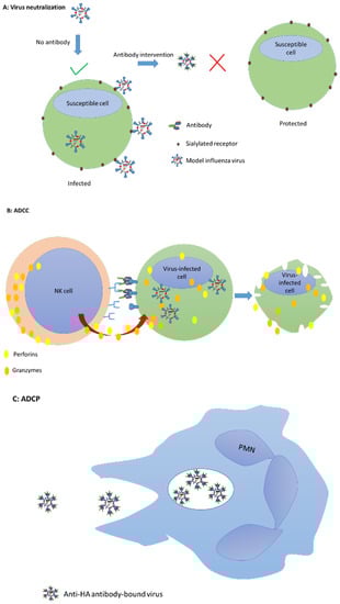 Passive immunotherapy has demonstrated rapid relief and life-saving capabilities in the treatment of viral infections like measles, rabies, HBV and others [141,142,143]. As established for RSV with the commercial immunotherapy palivizumab, antibody-based therapies with influenza antibodies could aid most susceptible populations including infants, which often suffer from influenza-related complications. Considering this, prophylactic use of antibodies should be considered as a part of an immediate management and care procedures. One of the approaches considered for antibody delivery is via recombinant virus vectors. Balazs et al. developed adenoviral-vectored human broadly neutralizing antibody (F10 or CR6261) which conferred protection in mice (who received the construct intramuscularly) during a pathogenic influenza virus (H1, H2, and H5) challenge [144]. Their experiments also showed equally protective amounts of the intramuscularly expressed F10 antibodies in the sera of both young and old mice and non-obese diabetic/ severe combined immunodeficiency/interleukin receptor subunit gamma null mice, suggesting how efficacious passive immunotherapy could be for both the aged and immunodeficient [144]. More so, antibody-based immuno-prophylaxis and -therapeutics have more prospects in effective intermediation of influenza outbreaks and production of specific influenza vaccines, noting that the broadly-reacting antibodies have the capacity to both inhibit virus replication and shedding [145]. A more consolidating evidence of passive immunotherapeutic management of a case infected with A(H5N1) which was described to have encountered rapid relief in less than two days after convalescent plasma administration, and interestingly, resulted in no detectable viruses by real-time polymerase chain reaction [146]. Furthermore, it is worth noting the diverse protective mechanisms by which antibodies can exert their functions directly on pathogens or on pathogen-infected cells: virus neutralization, antibody-dependent cell-mediated cytotoxicity (ADCC), antibody-dependent cell phagocytosis (ADCP), and antibody-dependent cell lysis (ADCL) are well-studied in the context of influenza viruses. ADCC, which mainly involves destruction of infected cells chiefly by natural killer (NK) cell activity (via perforin and granzyme B secretion into infected cells leading to cell lysis with destruction of intracellular pathogen), via recognition of antibody Fc that cross-links NK cell Fc receptors (FCRs), has been observed for murine antibodies weakly interacting with cognate influenza M2e [147]. Similarly, virus replication in mice was shown to be suppressed due to neutrophil-antibody based enhanced phagocytosis (ADCP) in pulmonary infected mice that either received anti-influenza serum before or after influenza infection, when neutrophils were retained and not inhibited by antibodies [148]. In direct virus neutralization, antibodies that bind the receptor-binding site (or nearby site) of hemagglutinin prevent the viral attachment to the host cell: these antibodies, that are mainly targeted against the globular head of HA, are elicited by either vaccination or natural infection [145]. ADCL is another mechanism that could augment the killing of influenza viruses as observed by Terajima et al., realizing that mostly neutralizing human monoclonal antibodies (either recognizing the globular head or stalk of HA) exerted this kind of effect, contrary to previously associated stalk-specific antibodies only [149].