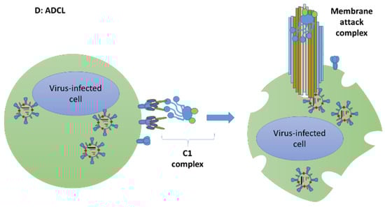 Mechanisms of antibody protection via passive immunization. This figure outlines the possible mechanisms by which antibodies could mediate instant protection when administered either as a prophylaxis or treatment. (A) Broadly neutralizing antibodies interact with HA interfering with the virus attachment to host cell. (B) Opsonized infected host cells attract natural killer (NK) cell destruction via the process of antibody-dependent cellular cytotoxicity (ADCC). (C) Opsonized virus particles activate their phagocytosis by polymorphonuclear cells (PMN) via the process of antibody-mediated cell phagocytosis. (D) Virus infected cells displaying the surface proteins of replicating viruses attract the assembly of the classical complement proteins forming a membrane attack complex that destroys the cell by osmosis in a process called antibody-dependent cell lysis (ADCL).