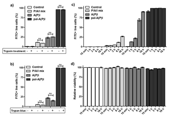 - Illien, F.; Rodriguez, N.; Amoura, M.; Joliot, A.; Pallerla, M.; Cribier, S.; Burlina, F.; Sagan, S. Quantitative fluorescence spectroscopy and flow cytometry analyses of cell-penetrating peptides internalization pathways: Optimization, pitfalls, comparison with mass spectrometry quantification. Sci. Rep. 2016, 6, 36938. [Google Scholar] [CrossRef] [PubMed]