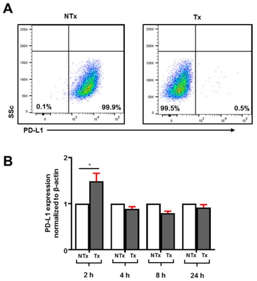 Effect of atezolizumab on PD-L1 expression on MDA-MB-231 cells. MDA-MB-231 cells were cultured in the presence or absence of atezolizumab for up to 24 h to investigate the effect of PD-L1 blockade on the surface and transcriptomic expression of PD-L1. Representative flow cytometric plots show PD-L1 expression on non-treated (NTx) and treated (Tx) MDA-MB-231 cells (A). The bar plot shows differences in PD-L1 transcriptomic expression in MDA-MB-231 cells up to 24 h Tx with atezolizumab (B).