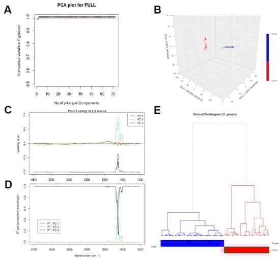 Chemometric analysis of FTIR experimental data on the full spectral range (4000–1000 cm−1). Amount of variance captured by PCs (A), PCA score plot (B), loading plots for the spectral data (C), squared correlation for the first three PCs for the spectral collection (D), and hierarchical clustering of the spectra for the different experimental samples (E).