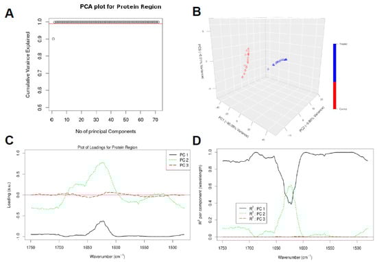 Chemometric analysis of FTIR experimental data on the protein region (1750–1480 cm−1). Amount of variance captured by PCs (A), PCA score plot (B), loading plots for the spectral data (C), and squared correlation for the first 3 PCs for the spectral collection (D).