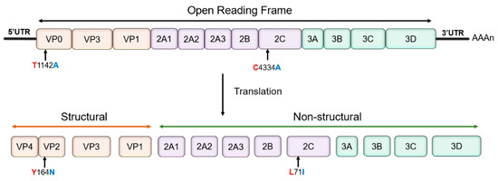 A schematic representation of the duck hepatitis A virus (DHAV)-3 genome. Comparative genomic analysis showed that there were two nucleotide substitutions (T1142A and C4334A) during the adaptation process, which led to two amino acid mutations in the VP0 (at residue 164) and 2C (at residue 71) proteins, respectively.