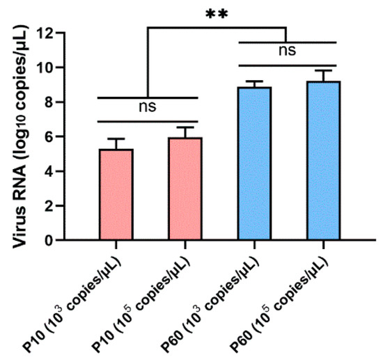 To analyze the replication capacity of the virulent parental strain and related embryo-adapted strain in embryonated duck eggs, viral titers in the allantoic fluid were assessed by qRT-PCR assay (Figure 2). The viral RNA load in the allantoic fluid of embryonated duck eggs infected with embryo-adapted strain was significantly higher than that infected with the virulent parental strain (p < 0.01). No significant difference was observed between the viral titers inoculated with different dilutions.