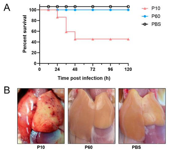 To further evaluate the pathogenicity of the virulent DHAV-3 strain and related embryo-adapted strain, 7-day-old ducklings were inoculated with 200 μL (105.0 copies/μL) of virus per duckling via the intramuscular route. During the observation period, ducklings inoculated with the virulent strain developed typical clinical symptoms (i.e., lethargy, ataxia, and opisthotonos), which resulted in a morbidity rate of 80% and a mortality rate of 60% at 120 hpi (Figure 3A). On post-infection day 1, ducklings in the virulent parental strain group developed clinical signs of infection, which resulted in the death of three ducklings at 24 hpi, six at 36 hpi, and three at 48 hpi. Notably, the attenuated strain did not cause clinical disease during the observation period.