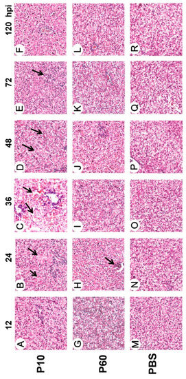 Histopathologic lesions detected in the liver tissues of ducklings inoculated with the virulent DHAV-3 strain (A–F), related embryo-adapted strain (G–L), and PBS (M–R). The livers had vacuolation and necrosis of hepatocytes (black arrows in B and C), a large number of infiltrating inflammatory cells, and multifocal confluent coagulative necrosis (black arrows in D and E).