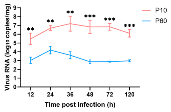 In vitro growth kinetics of the virulent strain and its embryo-passaged strain of DHAV-3 in the liver tissues of ducklings. The relative viral RNA load in liver tissues was measured by qRT-PCR. Each bar represents the mean ± SD (n = 3). The Student’s t-test was used to calculate the p values and 95% confidence levels. ** p < 0.01, and *** p < 0.001 (***) vs. the control group.