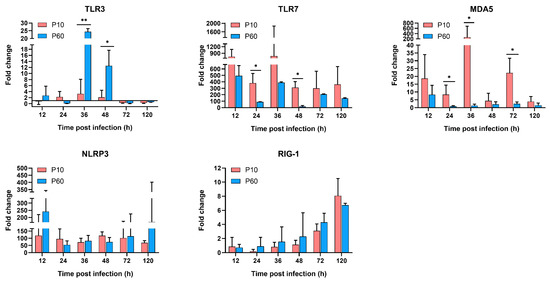 Dynamic activation of pattern recognition receptors (PRRs) genes in the livers of inoculated ducklings. Expression levels of these genes were detected by qRT-PCR analyses and analyzed using the 2-ΔΔCt method. Each bar represents the mean ± SD (n = 3). The Student’s t-test was used to calculate the p values and 95% confidence levels. * p < 0.05, ** p < 0.01.