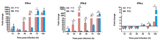 Dynamic activation of IFNs genes in the livers of inoculated ducklings. Expression levels of these genes were detected by qRT-PCR analyses and analyzed using the 2-ΔΔCt method. Each bar represents the mean ± SD (n = 3). The Student’s t-test was used to calculate the p values and 95% confidence levels. * p < 0.05, ** p < 0.01, and *** p < 0.001 (***) vs. the control group.