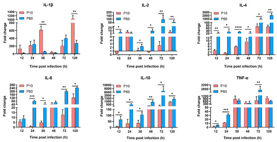 Among the tested proinflammatory and anti-inflammatory cytokines (Figure 8), there were significant differences in the mRNA expression levels of IL-2, IL-4, IL-6, and IL-10 following infection with the virulent vs. the attenuated strain (p < 0.05). Notably, the expression levels of the anti-inflammatory cytokines (IL-4 and IL-10) were significantly upregulated in the tissues of ducklings infected with the attenuated strain at all indicated time points (p < 0.05). Besides, significant upregulation of the proinflammatory cytokines (IL-2 and IL-6) was observed in the virulent strain group at multiple time points. These results indicated that infection with the attenuated strain could induce higher expression of anti-inflammatory cytokines to reduce inflammation, restore liver homeostasis, and avoid immune-mediated liver injury. In addition, the IL-1β expression patterns were irregular in both infection groups but were significantly upregulated following infection with the virulent strain at 36 and 120 hpi (p < 0.05). Furthermore, the expression level of TNF-α continuously increased from before 36 hpi and then was maintained at significantly high levels until the end of the experiment. Based on these results, we hypothesized that the attenuated strain could reactivate a well-regulated innate immune response without immune-mediated injury, which may contribute to the attenuation of liver injury and limit disease.