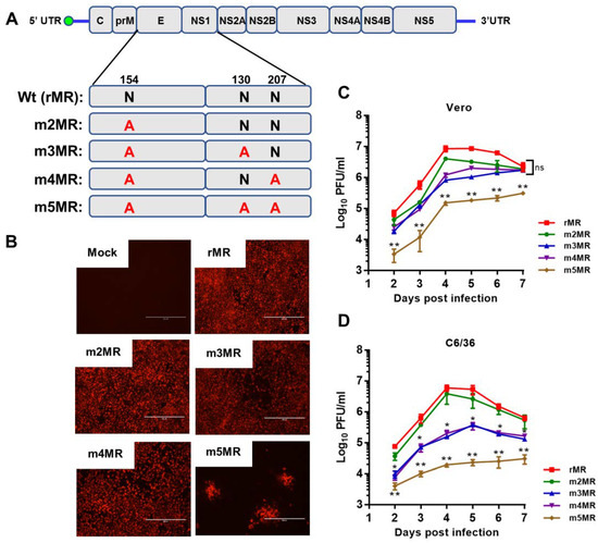 3.3. m5MR Virus Encoding both Non-Glycosylated E and NS1 Proteins is Highly Attenuated