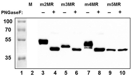 Since NS1 is secreted from cells infected with wild-type ZIKV, we examined the status of glycosylation of the NS1 protein and whether it is secreted from the mutant virus-infected cells. To address this, we infected Vero cells at an MOI of 1, and equal amounts of cell culture supernatants collected at 48 dpi were concentrated by acetone precipitation and either left undigested or digested with PNGase F (an enzyme that removes the glycan moiety from protein backbone) before being analyzed by Western blotting using an anti-NS1 antibody. The NS1 protein from m2MR virus-infected cell supernatant, which has the two intact glycosylation sites, upon digestion, migrated faster (Figure 2, lane 4) than the undigested NS1 (lane 3). The NS1 from m3MR- or m4MR-infected supernatants, each of which has a single glycosylation site, migrated faster (Figure 2, lanes 5 and 7) than the undigested protein from the m2MR (lane 3) but slower than the corresponding digested proteins (lanes 6 and 8). On the other hand, no difference in migration of NS1 in undigested or digested m5MR-infected cell supernatant was observed (Figure 2, lanes 9 and 10), indicating that the NS1 protein produced from this virus-infected cells lacked PNGase F sensitive glycans. Although m3MR and m4MR viruses possessed single glycosylation site mutations, the NS1 proteins from m4MR-infected cell supernatant (lane 7) migrated slower than that from m3MR-infected samples (lane 5), indicating that glycosylation at N130 residue may be more complex and heterogeneous than glycosylation at residue N207. Furthermore, since NS1 was secreted in significantly fewer amounts from m3MR- and m5MR-infected cells (lanes 5, and 6, 9, and 10) compared to m2MR- or m4MR-infected cells (lanes 3 and 4, 7 and 8), it appears that glycosylation at N130 may be important for efficient secretion of NS1. However, a detailed quantitative analysis of secreted and intracellular levels of each of these proteins would be necessary to strengthen such a conclusion.