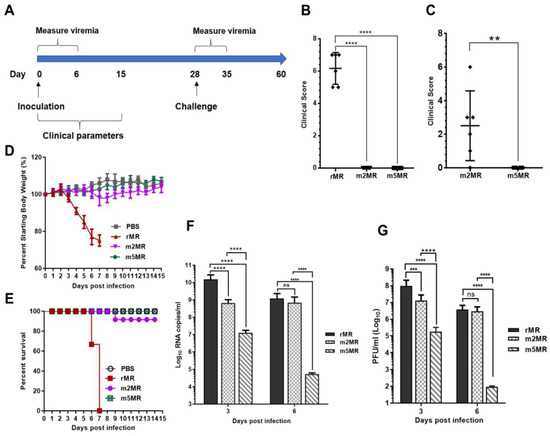 m5MR virus is attenuated in mice. (A) Scheme of virus inoculation and challenge study in three to four-week-old Ifnar1−/− A129 mice. Mice were injected subcutaneously (s.c.) with 1000 PFU (plaque-forming unit) of rMR (n = 6), m2MR (n = 12), and m5MR (n = 12) viruses on day 0. PBS was injected in the control group (n = 6). Clinical scores at 6 dpi for rMR, m2MR, and m5MR virus-infected groups (B) and 10 dpi for m2MR and m5MR virus-infected groups (C). (D) Weight loss and (E) Percent (%) survival of mice in infected or PBS control groups. Viremia in serum at 3 dpi and 6 dpi as measured by genome copy numbers (F) and infectious virus titers (G). Data presented are combined data from two independent experiments. Unpaired Student’s t-test (two-tailed) (for panel (B,C)) and Mann–Whitney test (for panel (F,G)) were used to determine significance between groups. ****, p < 0.0001; ***, p < 0.001; **, p < 0.01; ns, non-significant.