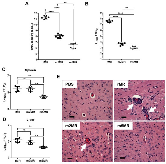 The mutant viruses replicate less efficiently in the brain of infected animals. Viral genome copy number (A) and infectious virus titer (B) in the brain of animals infected with rMR (n = 6), m2MR (n = 6), and m5MR (n = 6) viruses at 6 dpi. Infectious virus titers from the spleen (C) and liver (D) of the animals. Unpaired Student’s t-test (two-tailed) was used to determine significance between the groups. ****, p < 0.0001; **, p < 0.01. (E) Hematoxylin and eosin staining of sections of the cerebrum of animals inoculated with PBS, or infected with rMR, m2MR, or m5MR viruses. Representative images of the cerebrum (40x) from animals in each group are shown. Prominent perivascular cuffing in rMR- and m2MR-infected samples are shown with white arrows. Scale bar (at bottom left), 60 µm.