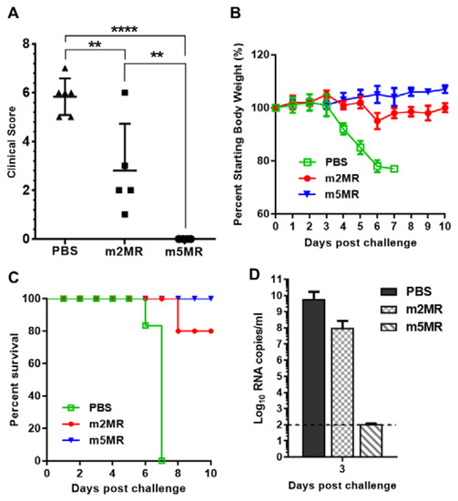 Interestingly, all mice in the m5MR group survived the challenge, whereas 80% of mice in the m2MR group and none in the PBS control group survived the challenge (Figure 5C). Additionally, we observed 2 log lower levels of challenge virus (rMR) viremia in m2MR-infected animals compared to PBS control group and undetectable levels of challenge virus (rMR) viremia in m5MR-infected animals following challenge (Figure 5D). Overall, the results show that the m5MR virus-infected animals were fully protected upon lethal virus challenge, whereas mice in m2MR group were partially protected compared to the m5MR group. These results suggest that protective immune responses were induced in these animals by the m5MR and m2MR viruses.