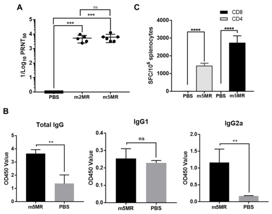 In a separate study, A129 mice were injected with PBS (n = 4) or m5MR (n = 5) virus, the sera and spleen were collected at 28 dpi. Examination of IgG isotypes in serum revealed that the m5MR group had significantly higher total IgG and IgG2a antibody responses as compared to those in the PBS control group (Figure 6B). The IgG1 was not significantly different in the mice between the two groups (Figure 6B).