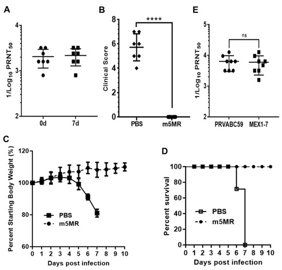 3.4. m5MR Virus Protects Immunocompromised Mice from Lethal Challenge