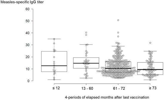 3.4. Temporal Changes in Measles-IgG Antibody Titers