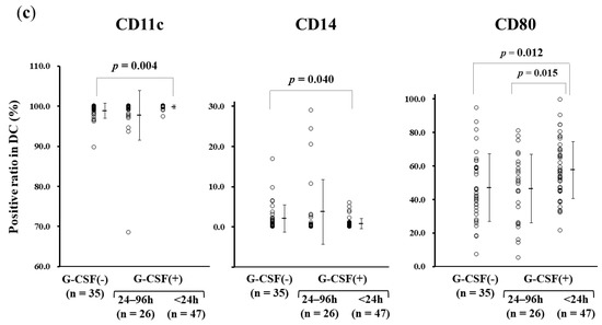 The intensity of the yielded DCs with CD11c was increased in the 24-h G-CSF-treated group compared with the non-treated group (p = 0.004), while CD14 was expressed to a lower degree in the 24-h G-CSF-treated group (p = 0.040). CD80+ DCs in the 24-h G-CSF-treated group were compared with the 24–96-h G-CSF-treated and non-treated groups (p = 0.015 and p = 0.012, respectively) (Figure 3c).