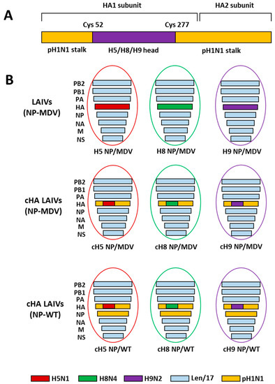 Overview of the LAIV viruses used in this study. (A) Schematic representation of the chimeric HA protein structure. (B) Genome composition of the LAIV reassortant viruses rescued in this study.