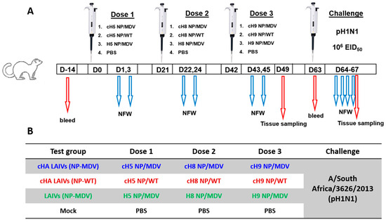 Four groups of seven ferrets were inoculated intranasally with three doses of LAIV viruses or phosphate-buffered saline (PBS) placebo at 21-day intervals, as illustrated in Figure 2. The vaccine viruses were administered in a dose of 7.0 log10EID50 and an inoculum of 0.5 mL.