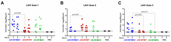 Replication of LAIV viruses in the upper respiratory tract of immunized ferrets after the first (A), second (B) and third (C) vaccine dose.