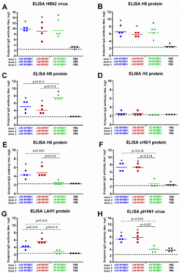Cross-reactivity of the induced antibody responses. Serum IgG endpoint antibody titers in immunized ferrets were measured by ELISA against: H5 NP/MDV LAIV whole virus antigen (A); H8 full-length HA protein (B); H9 full-length HA protein (C); H3 full-length HA protein (D); H6 full-length HA protein (E); pH1N1 whole virus antigen (F); cH6/1 chimeric HA protein (G); and long alpha helix 1 (LAH1) recombinant protein (H). * indicates significant difference with the mock-vaccinated group. The dashed line indicates the limit of detection.