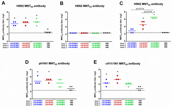 Neutralizing activity of the induced antibody responses. Broadly neutralizing antibody responses in immunized ferrets were measured in 50% microneutralization test (MNT50) against: H5 NP/MDV LAIV virus (A); H8 NP/MDV LAIV (B); H9 NP/MDV LAIV (C); A/South Africa/3626/2013 (pH1N1) virus (D); and cH11/1N1 LAIV virus (E). * indicates significant difference with the mock-vaccinated group. The dashed line indicates the limit of detection.