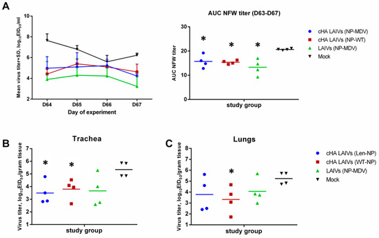 Virus replication in the ferrets’ respiratory tract was assessed by endpoint titration of NFW, lung and trachea specimens in embryonated chicken eggs. Tenfold sample dilutions were inoculated into 10–11-day-old eggs and incubated at 33 °C for 72 h (for LAIV viruses) and at 37 °C for 48 h (for the SA13 pH1N1 challenge virus). Virus titers were expressed as log10EID50/mL for NFW and log10EID50/gram for trachea and lung specimens. In addition, the pH1N1 viral load in NFW specimens was expressed as the area under the curve (AUC) of the NFW virus titer during the four days post challenge. The AUC was calculated using the trapezoidal rule.