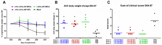Clinical signs of influenza infection in immunized ferrets after challenge. (A) Dynamics of body weight change during the challenge phase. (B) Area under the curve of percentage body weight change for each ferret. (C) Sum of scores for clinical signs for each ferret during the four days after the challenge. * Significant difference from the mock-vaccinated group (Mann-Whitney U test).