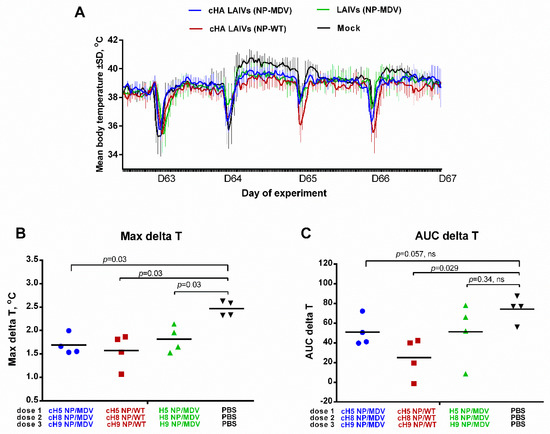 The body temperature of the ferrets in the challenge phase is shown in Figure 10A. There was a significant difference between all three vaccine groups and the control group in the maximal delta T parameter (Figure 10B), suggesting that the vaccinated animals were protected against severe fever. However, in terms of the area under the curve, the only significant difference was between the cHA LAIVs (NP-WT) group and the controls (Figure 10C). These data suggest that, while all vaccine regimens reduced fever similarly, the duration of fever was significantly shorter in animals that received LAIVs containing chimeric HA and WT NP.