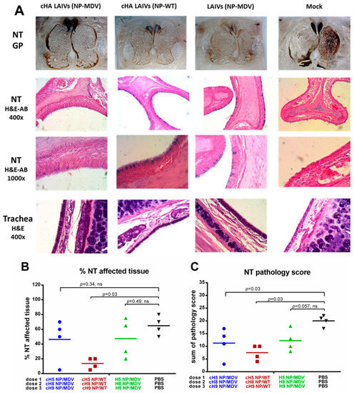 Analysis of pathological changes in URT tissues demonstrated that all vaccinated groups were protected from damage to respiratory epithelium after H1N1pdm09 challenge: mucus-producing goblet cells (stained with alcian blue stain) were preserved in NTs of LAIV-vaccinated ferrets, whereas these cells were absent in the mock-vaccinated group (Figure 11A). However, semi-quantitative analysis of pathological changes in nasal turbinates, and estimation of the percentage of affected tissue, revealed significant protection only in the two groups given LAIV that expressed chimeric HAs (Figure 11B,C). Interestingly, only the cHA LAIVs (NP-WT) group was significantly protected in terms of both the percentage of affected tissue and the total pathology score (Figure 11B,C). A semi-quantitative analysis of the infection pathology of individual NT specimens is given in Supplementaly Materials Table S1.