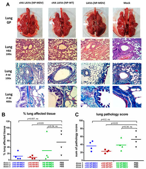 In conclusion, all groups of vaccinated animals showed fewer pathological changes and a lower percentage of affected tissue in the lungs than the control group. However, differences in the pathology score and percentage of affected tissue were statistically significant only for the cHA LAIVs (NP-WT) group, most likely because of the low number of animals analyzed (Figure 12B,C). A semi-quantitative analysis of the infection pathology of individual lung specimens is given in Supplementary Materials Table S2.