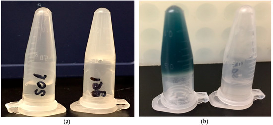To create an “antigen depot effect” for an enduring immune stimulation, we loaded dry ERA-2GnRH vaccine into a chitosan solution. Viscosity is one concern for chitosan hydrogel needle injection; where, a high gel concentration retains antigen longer but is difficult to inject. To optimize the vaccine formulation by balancing antigen retention and gel viscosity, we concentrated and freeze-dried the virus, and loaded it into a 1.2% chitosan hydrogel, a concentration we pretested for mouse i.p. injections (data not shown). The formulated ERA-2GnRH chitosan hydrogel vaccine was liquid O/N at 4 °C, remained liquid at R/T (22 °C ± 3 °C) for ~1 h, and became a semi-solid gel at 37 °C between 5 and 10 min (Table 1). The gelling was visualized by adding a blue dye and simply inverting the tube, with the gel sticking to the top of the inverted tube (Figure 1). Using a 3 mL syringe with a 23-gauge needle, the formulated ERA-2GnRH vaccine was drawn and pushed out freely. The final vaccine for mouse inoculation was a 1.2% chitosan solution, loaded with 1.0 × 108 ffu/mL ERA-2GnRH in the thermo-responsive hydrogel.