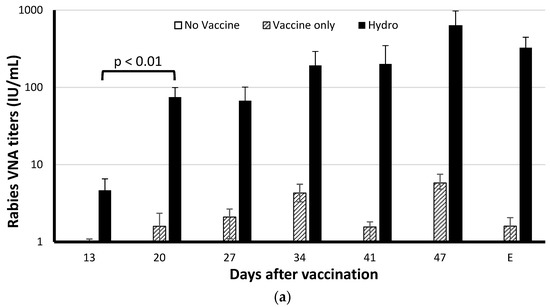 The chitosan hydrogel may help induce a continuous rVNA response over time. We observed in mice that the ERA-2GnRH hydrogel vaccine was absorbed and no lesions were observed at the injection site during necropsy when the experiment ended. Chitosan has a safe profile in administration, has been used as a food supplement, and is being used in the pharmaceutical industry for drug delivery and tissue engineering [30,31,32]. The adjuvanticity of chitosan has also been demonstrated in many studies [14,15,16] with the transition from a liquid state to a semisolid hydrogel creating an “antigen depot” effect after injection into the animal, and thus the ERA-2GnRH induces a long-lasting immunity. In our study, the vaccine in hydrogel generated persistent and high rVNA from day 13 until the experimental endpoint. The 20 mice in the hydrogel group (Group C) had rVNA of 327.40 IU/mL compared to 1.60 IU/mL in the vaccine only group (Group B) at the experimental endpoint. This data supports the concept that ERA-2GnRH vaccine in chitosan hydrogel could induce longer rabies protection in dogs than traditional rabies vaccine.
