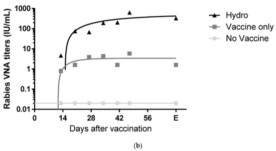 Dynamics of rabies virus-neutralizing antibody titers after immunization in mice. (a) Geometric mean titer with standard deviation and (b) non-linear curve fit for each group at each time point are shown on a log-scale. Mice in Group A (n = 10) received no vaccine. Mice in Group B (n = 20) received inactivated ERA-2GnRH (Vaccine only). Mice in Group C (n = 20) received an equivalent dose of inactivated ERA-2GnRH in a chitosan hydrogel (Hydro). The end of the study (E) was approximately 70 days post-vaccination but varied for each group based on fertility.