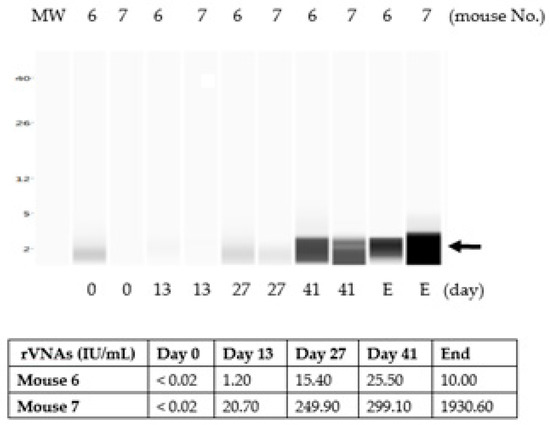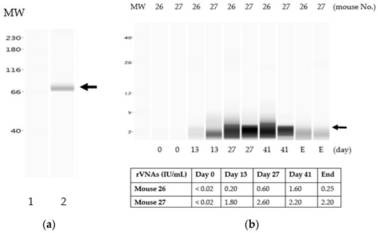 Antibody dynamics of GnRH in mice vaccinated with the liquid ERA-2GnRH vaccine. Protein detection using the ProteinSimple Wes. (a) Detection of recombinant protein G-2GnRH using antibodies against GonaCon; lane 1, molecular weight (MW) marker; lane 2, recombinant G-2GnRH protein from purified ERA-2GnRH virus; (b) GnRH antibodies in representative mice receiving the liquid ERA-2GnRH vaccine over time; GnRH antibodies were detected in mouse 26 and 27 (Group B) from day 13 through day 41 and then decreased until the end of the experiment (E, ~day 70). Similarly, the rVNA titer was positive on day 13, went up on days 27 and 41, and declined until E.