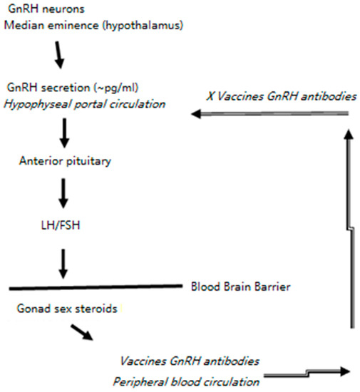 There is a broad interest in finding a non-surgical fertility control method for free-ranging animals, shelter dogs and cats, pest animals, overpopulated animals, and zoo animals [33,34,35,36,37,38]. Under experimental conditions, many investigations achieved temporary and reversible infertility in animals using GnRH analogs, or antagonists, including antibodies against GnRH [39,40,41,42,43,44,45]. The mechanism of how GnRH antibodies impair animal reproduction is depicted in Figure 5. The idea of using an immune contraceptive vaccine for animal population control started about half a century ago with porcine zona pellucida (PZP), a raw glycoprotein mixture exacted from pig ovaries [46,47,48,49]. PZP vaccination prevents sperm from binding to oocytes, and thus is only appropriate for contraception in female animals. The United States Environmental Protection Agency licensed the PZP vaccine ZonaStat-H and GnRH vaccine GonaCon for use in wild horses and burros [50,51]. With the help of strong adjuvants (Freund’s incomplete adjuvant FIA in ZonaStat-H, and Adjuvac in GonaCon) and high protein/antigen concentrations, multi-year infertility in animals was achieved after GonaCon immunization [52,53]. However, we know antibodies after immunization will peak during a time window, subside, and eventually become undetectable in months or years. “Developing a permanent, single-dose non-surgical sterilant for male and female cats and dogs” is a challenge goal that the Alliance for Contraception in Cats & Dogs has been leading since 2000 [54].