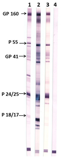 Further, sera were tested for the presence of antibodies specific to HIV-1 proteins (Figure 5). For the purpose, we used a commercially available test system, New Lav Blot 1 (Bio-Rad), including nitrocellulose stripes coated with HIV-1 proteins. Pre-immune sera were used as a negative control, while inactivated human serum containing anti-HIV-1 antibodies (from the New Lav Blot 1 kit) served as a positive control.
